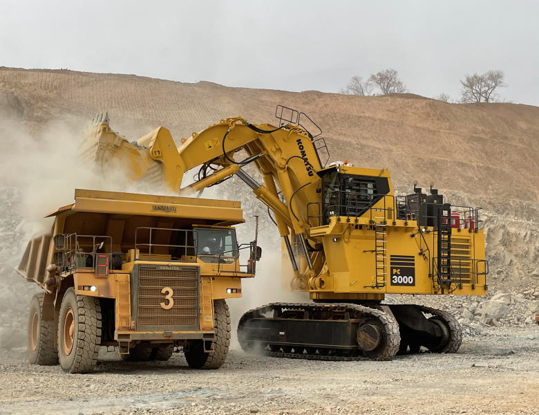 The PC3000 is the smallest hydraulic excavator in our product range. The engine power is 940 kW / 1260 HP @ 1800 rpm. The operating weight is from 250 - 261 ton. The shovel capacity is 16m³, the backhoe capacity 16m³. It matches from 85 to 165 U.S. ton trucks.