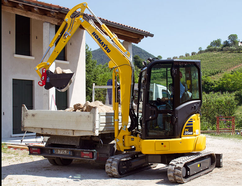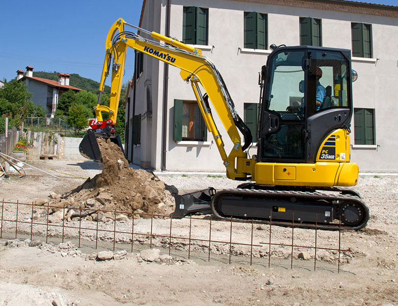 The new PC35MR-5 is an hydraulic mini excavator with tight tail swing radius and swing booms that hug the machine to help with work in tight spaces. PC35MR-5 uses up to five percent less fuel than its MR-3 predecessors, with no loss of performance or productivity.